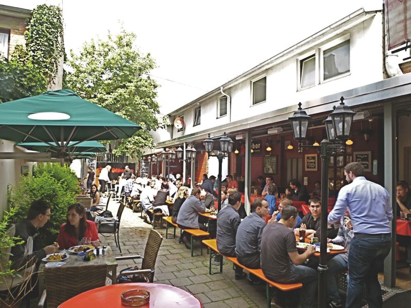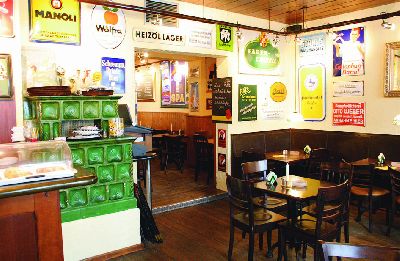 Kultkneipe mit grünem Kachelofen und nostalgischen Emaille-Werbeschildern. Mo: Whiskey & Rum-Abend, Di: selbstgemachtes Popcorn, Mi: Pro-Bier-Tag, Do: Weintag. Morgens „Hammerfrühstück“ mit Brötchen aus der hauseigenen Backstube und Müsli mit Erdbeer- oder Himbeersoße. Günstige Tagesessen und Wochen-Tagesessen. Nach Belieben zusammenkreuzbare „Bastelflammkuchen“. Spezielles für Vegis, Salatler, Fleischler. Das Cocktail-Labor (Do-Sa) wurde auf handgeschüttelten und -gerührten Betrieb umgestellt, Do mit KSC-Kartenverlosung.