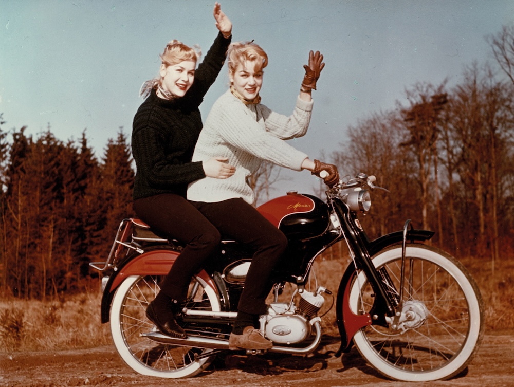 Bild: Die Filmschauspielerinnen Isa und Jutta Günther auf dem Moped Monza von Gritzner-Kayser, 1962, Foto: Stadtarchiv Karlsruhe 8/FA Gritzner 845